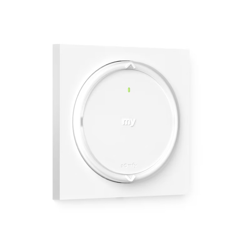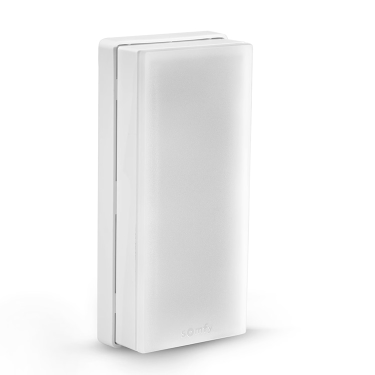 1-kanals bryter for styring av utvendig og innvendig solskjerming Innebygd innendørs temperatursensor (via TaHoma) Opp-, Ned- og Stopp-knapp (my)